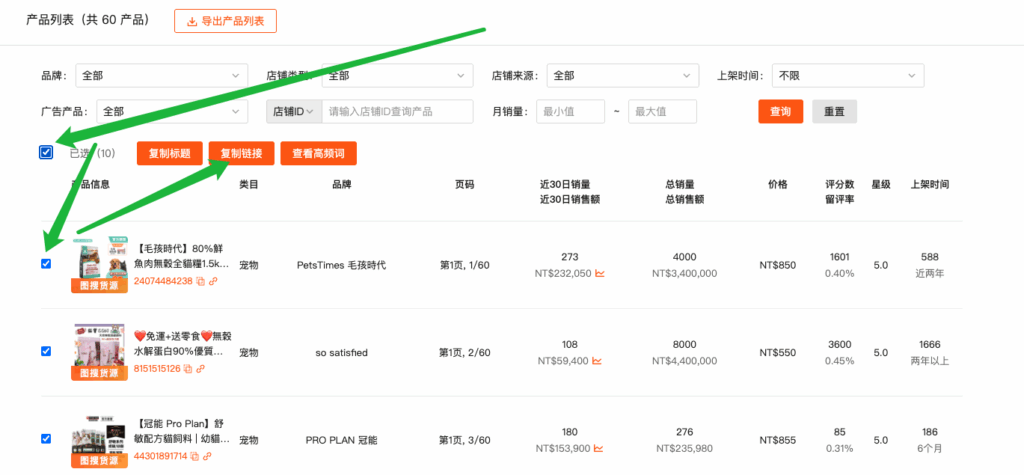 - ✅ 接着你可以选择 全选,或者 一个个勾选 想要复制的产品链接。选好之后,就能一键批量 复制链接 啦