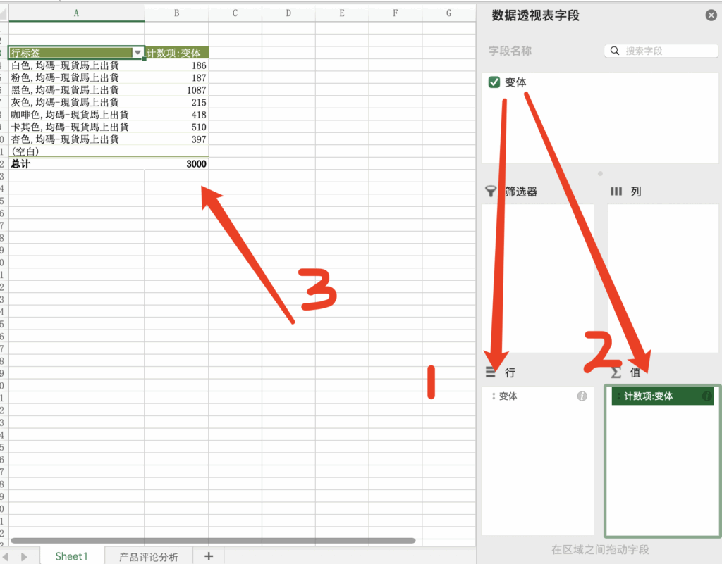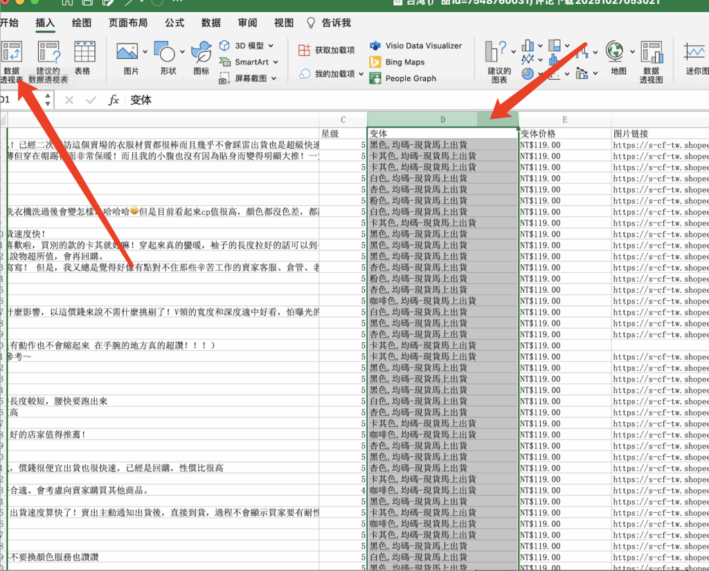 打开下载的评论文件后,选中d 列后对d 列进行数据透视: