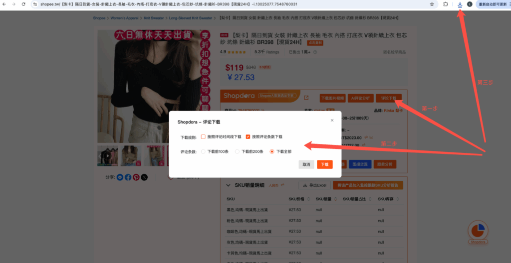 第一步:安装 shopdora 插件后,点击「评论下载」,获取商品的评论数据文件;