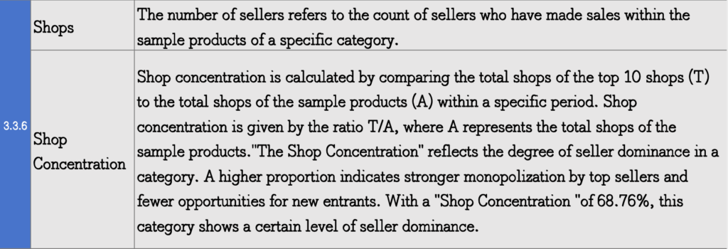 - Competition Indicator: Identifies the competitive stage of a category. Seek out categories in the early or middle stages of competition, not yet dominated by brands or major sellers.