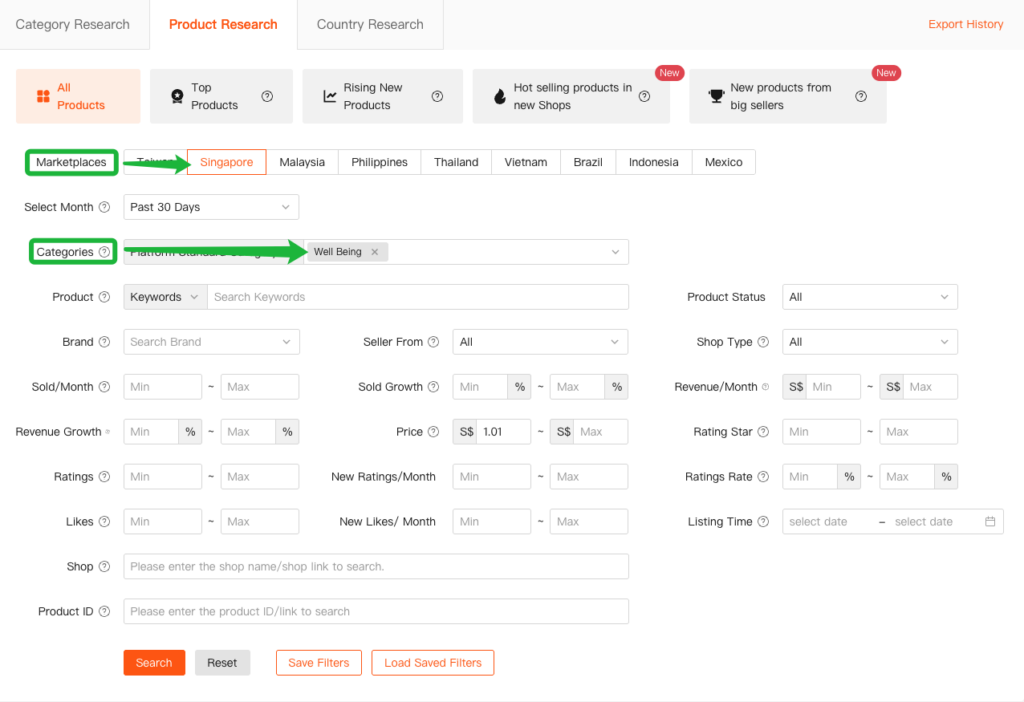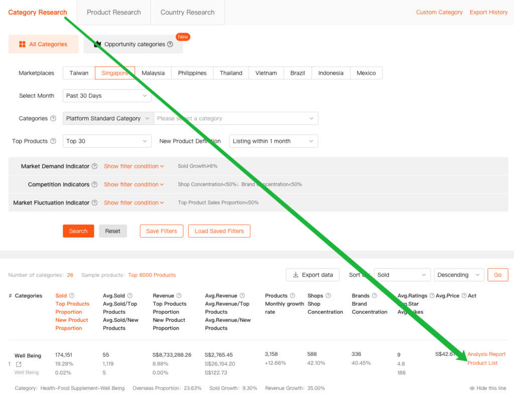 When you click Product List, the system will automatically navigate to the Product Research page and pre-fill the corresponding Marketplaces and Categories. This allows you to directly view all products under the selected marketplace and category without additional manual input.