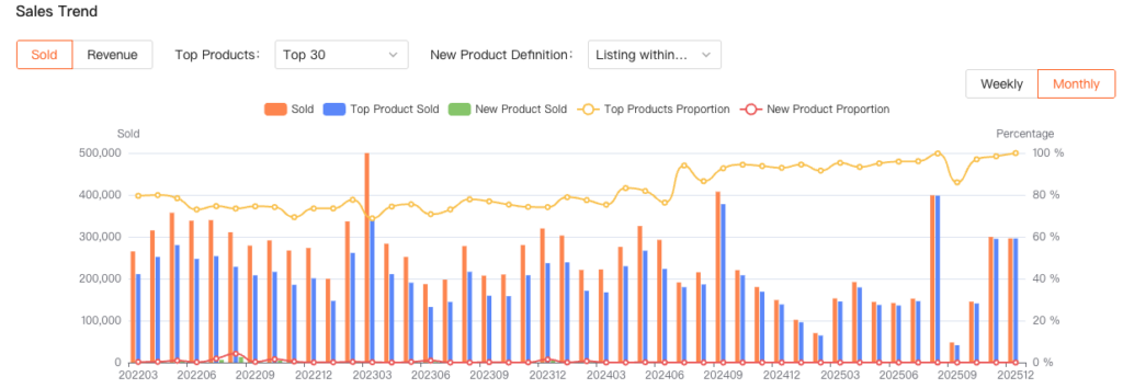 A higher proportion of Top Products (shown in the blue bar chart and yellow line chart) typically indicates a more stable market structure, leaving less room for new products (shown in the green bar chart and red line chart). This suggests that it may be more challenging for new products to enter the market.