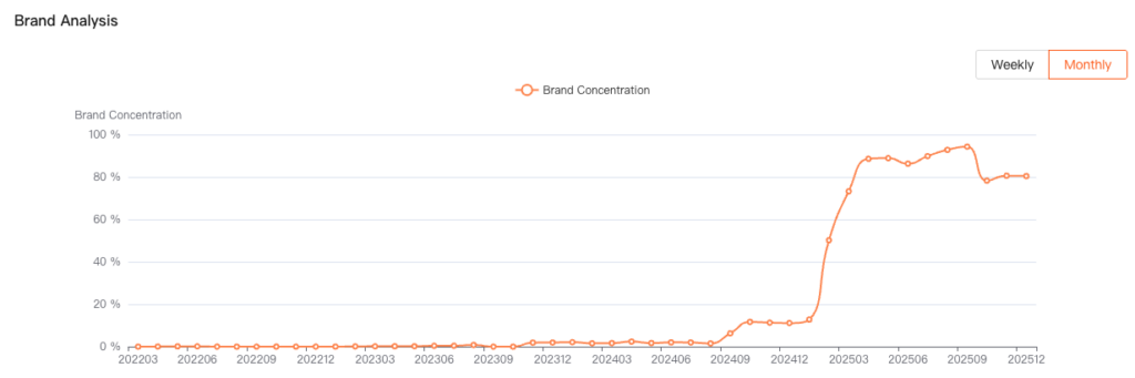 A higher—or rising—brand concentration indicates that the market is increasingly dominated by leading brands, making the competitive environment more challenging for new or smaller brands.