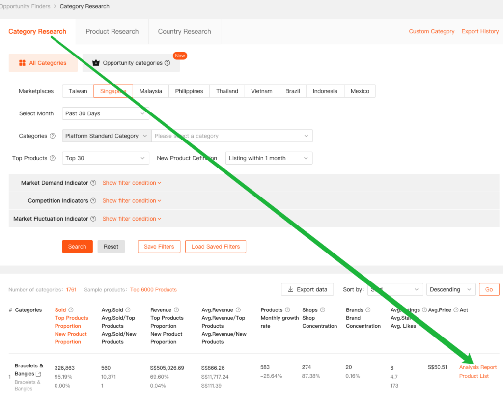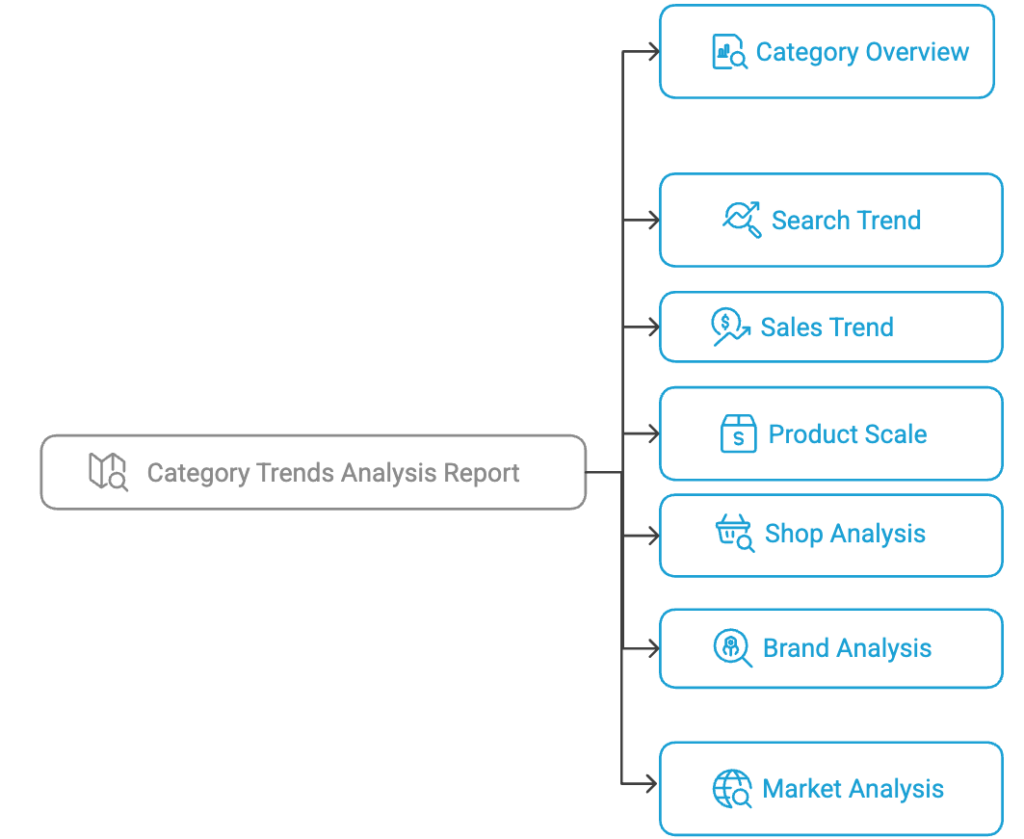 Click the “Analysis Report” view in the action area to access the Category Overview and the six core data dimensions: Search Trend, Sales Trend, Product Scale, Seller Analysis, Brand Analysis, and Market Analysis.