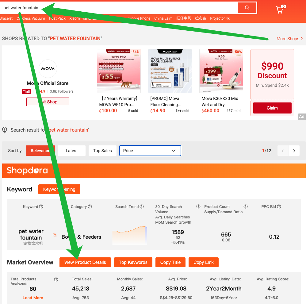 ✅ After entering a product keyword in the search bar, click “View Product Details” in the plugin panel below the search results.