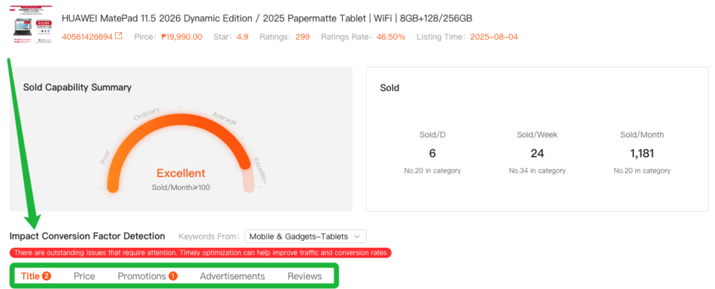 In Shopee operations, low conversion despite traffic or stagnant growth is a common challenge. Shopdora’s Product 360 tool analyzes five key factors that affect sales performance: Title, Price, Promotions, Advertisements, and Reviews. It helps identify optimization opportunities based on real-time data and competitive benchmarks.