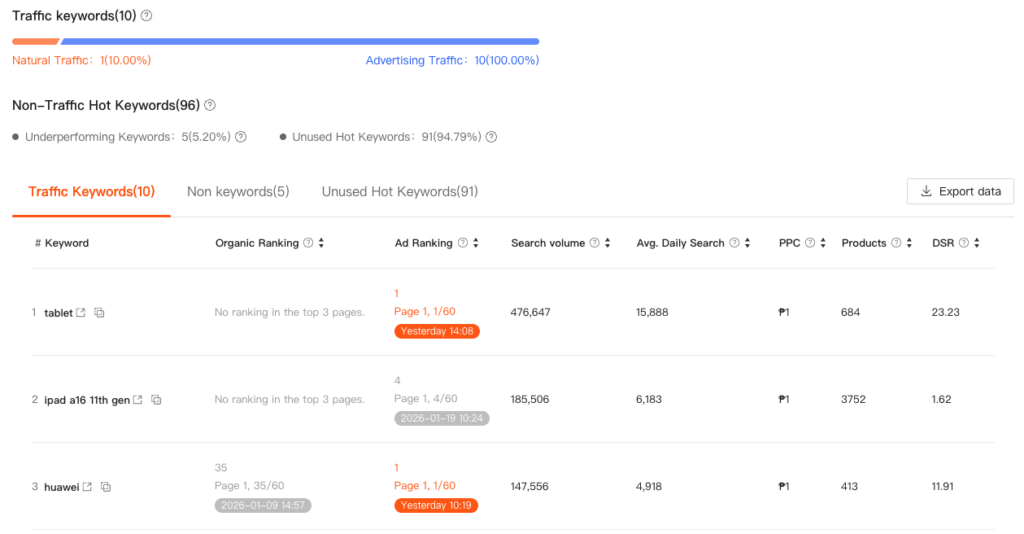 • If natural traffic is weak, increase advertising investment and ensure ≥ 5 effective advertising traffic keywords.