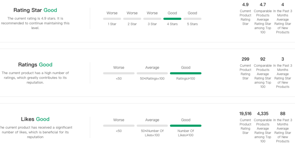 • Evaluate rating star, ratings, and likes.