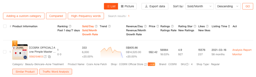 | Sold/Day, Sold/Month, Growth Rate | Monthly Sales Volume: Total units sold within the selected time period. If the time period is the past 30 days, it represents sales in the last 30 days; if a specific month is selected, it reflects that calendar month’s sales. Growth Rate: Percentage change compared to the previous period. |