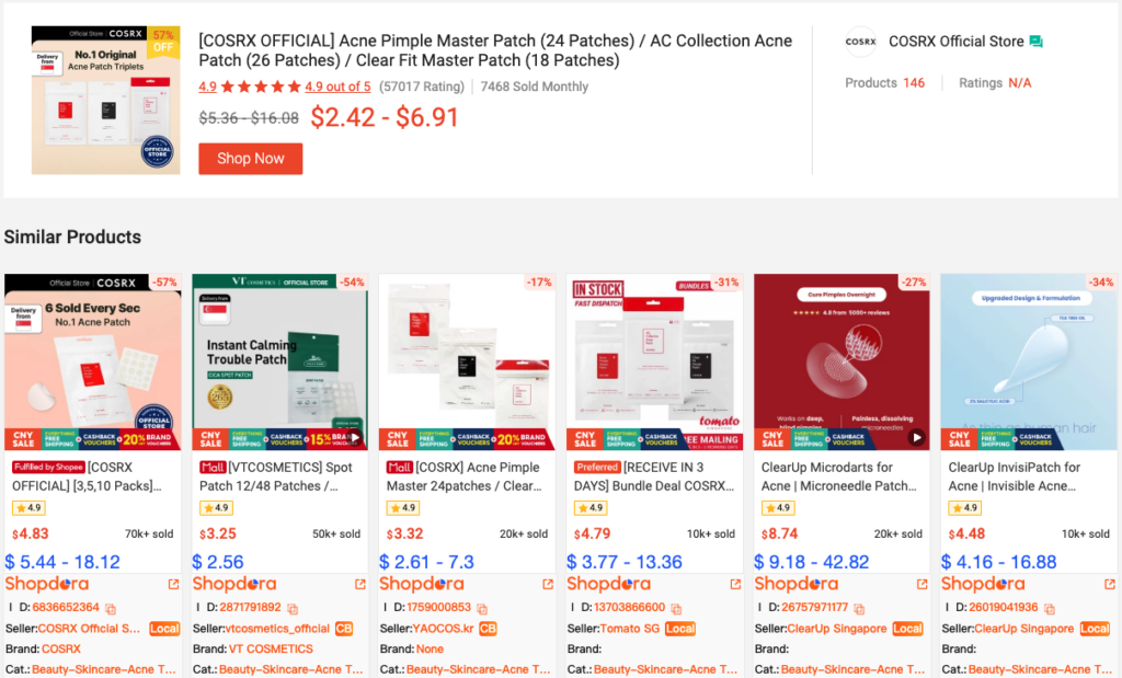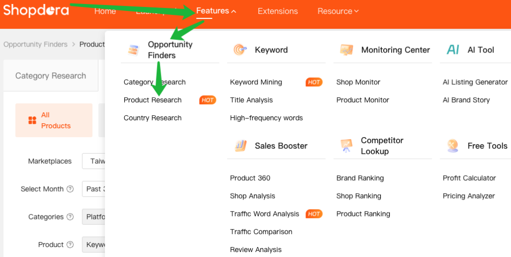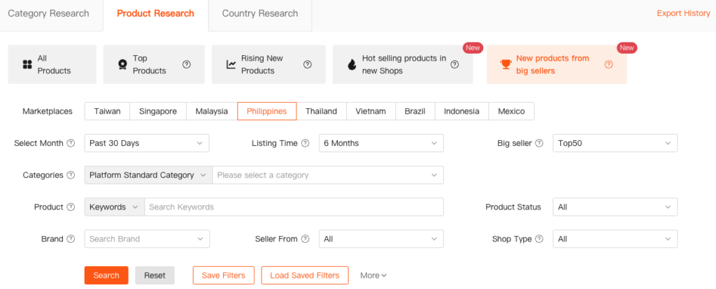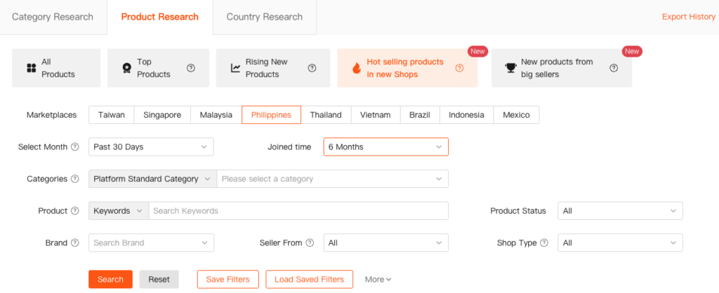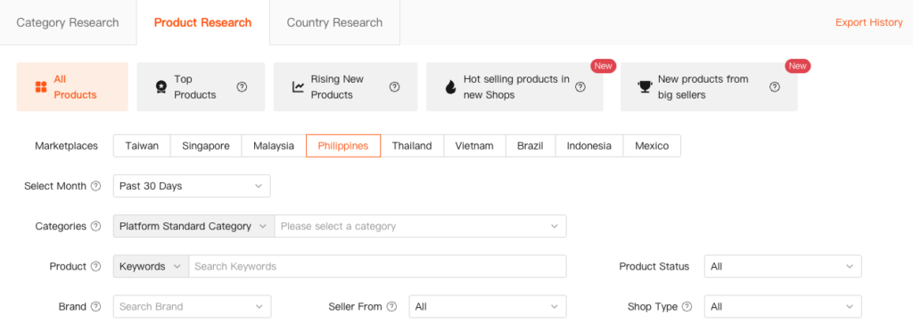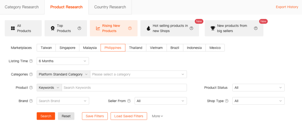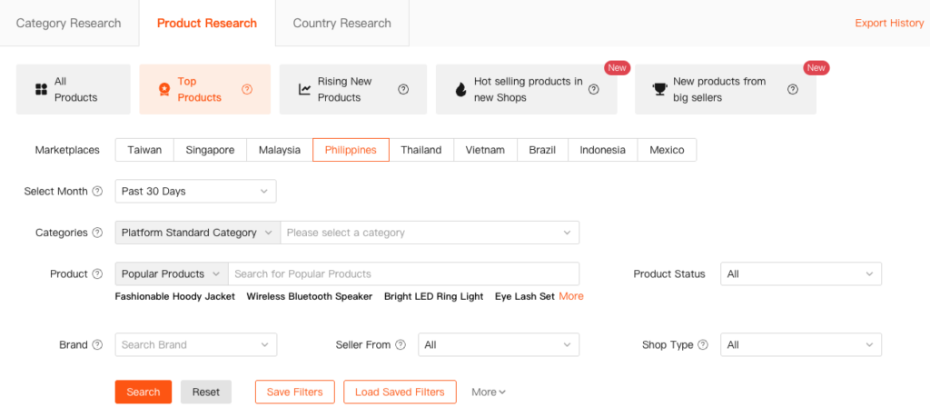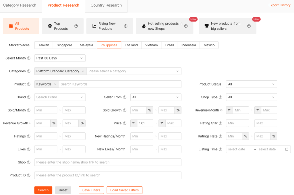 | Categories | Filter products by Platform Standard Category or Custom Category. | Platform Standard Category: Official Shopee categories, up to 5 levels deep. Custom Category: User-defined categories for personalized analysis. |