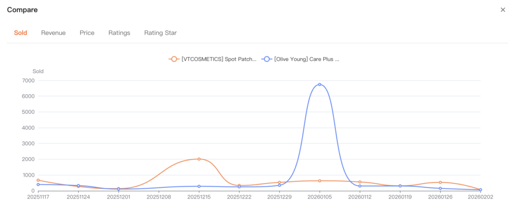 Multiple products can be selected for comparison. The chart provides a clear visual comparison of changes across five key metrics: Sold, Revenue, Price, Ratings, and Rating Star.