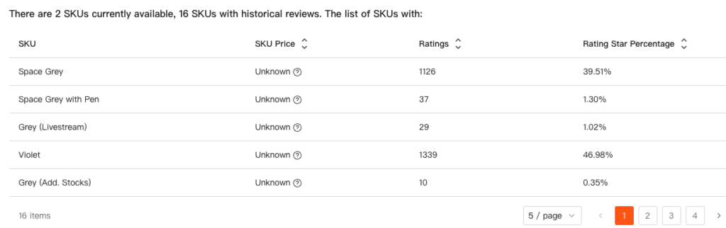 - SKU Review Distribution: This feature helps sellers approximate the sales performance of different SKUs based on review data, quickly identifying the most popular SKUs and providing insights for product selection and creating bestsellers.