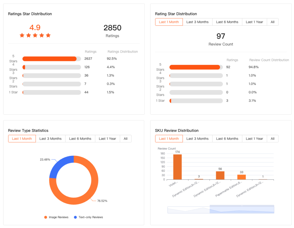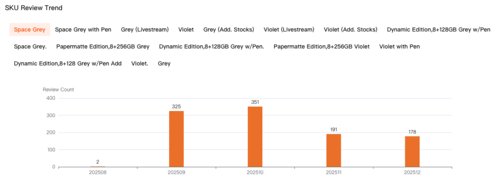 - Sellers can compare the number of reviews for each SKU within the same time period to evaluate market performance. Generally, SKUs with more reviews in the same time frame indicate better sales performance and higher customer acceptance.