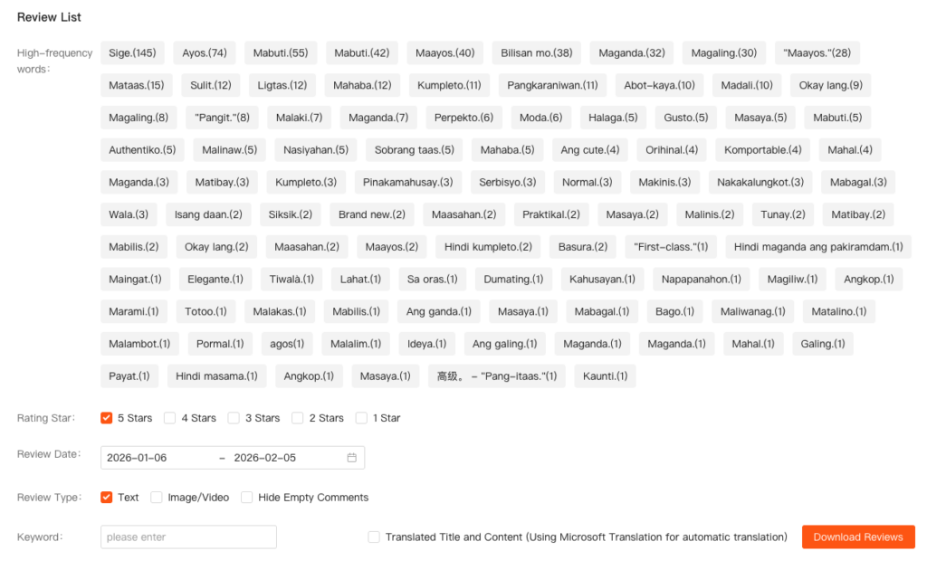 - Filter Options: High-frequency words, Rating Star, Review Date, Review Type, Keyword.