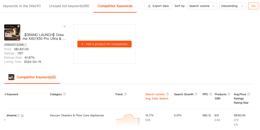 A competitor uses “for Pet Hair,” which has 12,000+ monthly searches and low competition. If your vacuum also handles pet hair well, add a phrase like “Pet Hair Friendly” to your title.