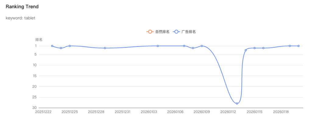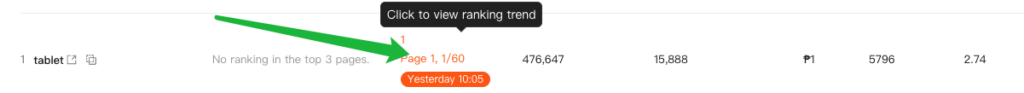 💡 Tip: Click directly on the ranking label (e.g., “Page 1, 1/60”) to view the ranking trend for that keyword over time. This helps you monitor performance stability and evaluate the impact of listing or advertising changes.