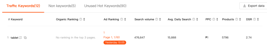 Advertising Traffic Keywords These are keywords for which you’ve run a paid ad campaign, and your product appears in Shopee’s sponsored (ad) positions. These reflect your ability to gain search visibility through paid promotion and are used to evaluate ad coverage and performance.