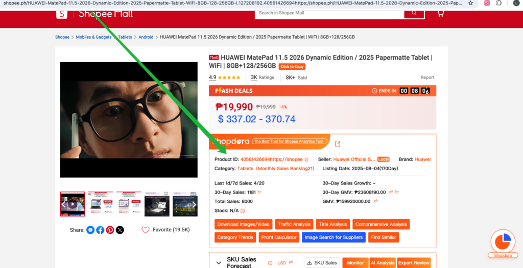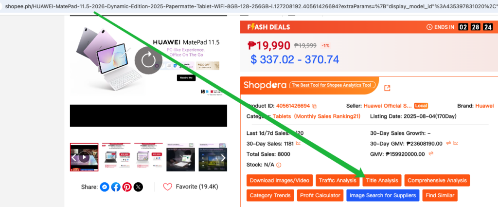 Alternatively, if already on the Shopee product detail page, use the Shopdora browser extension to launch Title Analysis directly from the page.