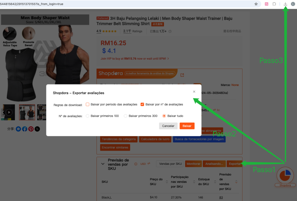 Passo 1: Após instalar as Extensões do Shopdora, clique em “Baixar Avaliações” para obter o arquivo de dados de avaliações do produto.