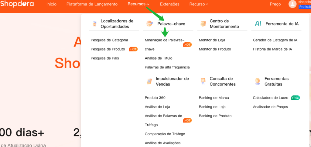 A funcionalidade de Mineração de Palavras-chave do Shopdora parte de uma palavra-chave alvo e expande palavras-chave relacionadas por meio de produtos associados. Ela amplia a cobertura de palavras-chave passo a passo (de 1–10, 10–100, 100–1.000+), construindo gradualmente uma biblioteca de palavras-chave grande e relevante. Isso ajuda a criar mais pontos de entrada de pesquisa para seus produtos e capturar tráfego adicional de palavras-chave.