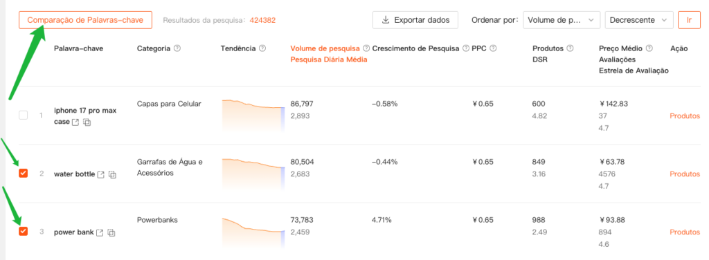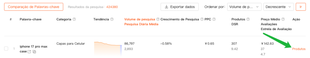 | Produtos (DSR) | Produtos:Refere-se a quantos produtos relacionados aparecem após buscar por esta palavra-chave; DSR= Volume médio diário de busca (demanda) / Número de Produtos (oferta), usado para avaliar a força da demanda. |