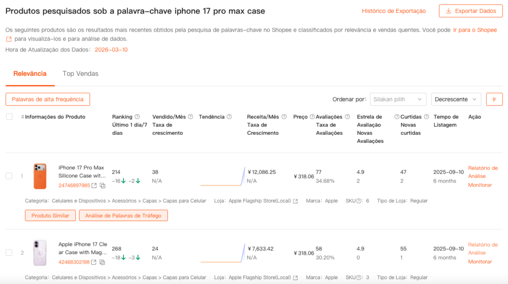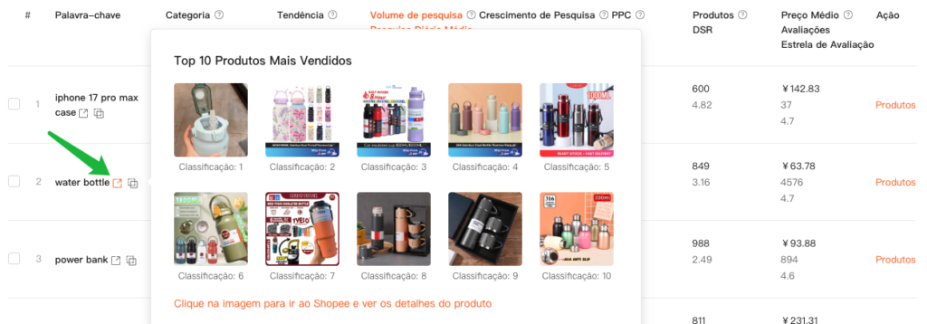 - Revise os 10 principais produtos nos resultados de busca orgânica da Shopee para aquela palavra-chave.