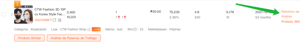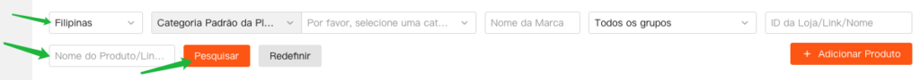 Após o produto ser adicionado, você pode pesquisá-lo por Marketplaces, link do produto ou outros filtros disponíveis.