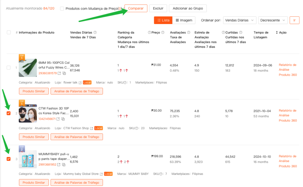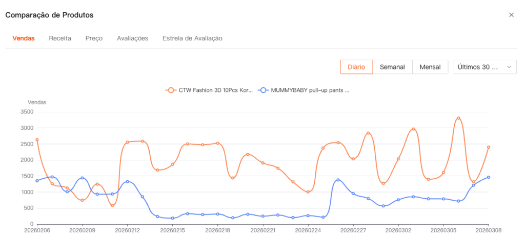 Selecione vários produtos para comparação e contraste visual de suas tendências de Vendas, Receita, Preço, Avaliações e Estrelas de Classificação. Isso ajuda os vendedores a identificar rapidamente diferenças no desempenho de mercado.