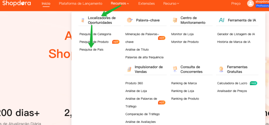 • Navegue até Localizadores de Oportunidades → Pesquisa por País