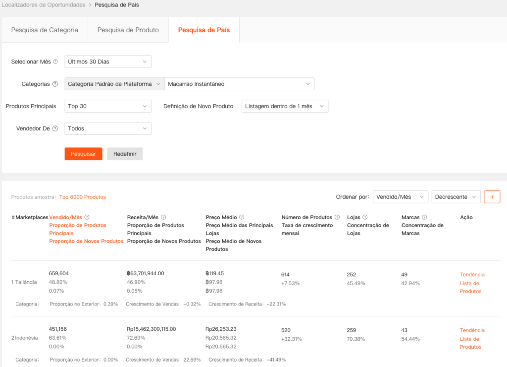 No modelo operacional multimercado da Shopee, cada marketplace difere significativamente em preferências dos usuários, poder de compra, intensidade competitiva e ritmo de crescimento. O recurso Pesquisa por País do Shopdora suporta a comparação lado a lado de produtos dentro da mesma categoria nos nove principais marketplaces da Shopee — Taiwan, Singapura, Malásia, Filipinas, Tailândia, Vietnã, Brasil, Indonésia e México. Ao analisar o desempenho em nível de categoria em vários sites, os vendedores podem identificar diferenças de mercado com mais eficiência e determinar quais marketplaces são mais adequados para entrada prioritária ou expansão focada.