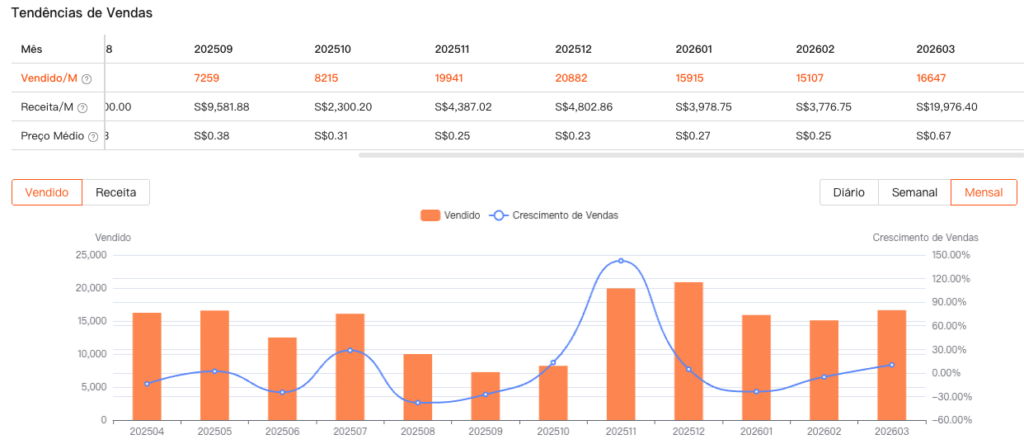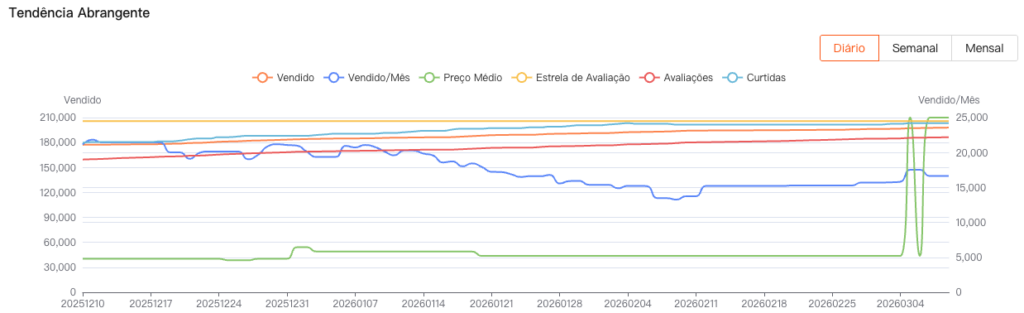 O gráfico de Tendência Abrangente fornece uma visão geral clara do desempenho do produto, mostrando as mudanças no volume de vendas (Vendidos, Vendidos/Mês), Preço Médio, Estrela de Avaliação, Avaliações e Curtidas ao longo do tempo. Ele ajuda os vendedores a avaliar rapidamente o desempenho do produto e a dinâmica do mercado.
