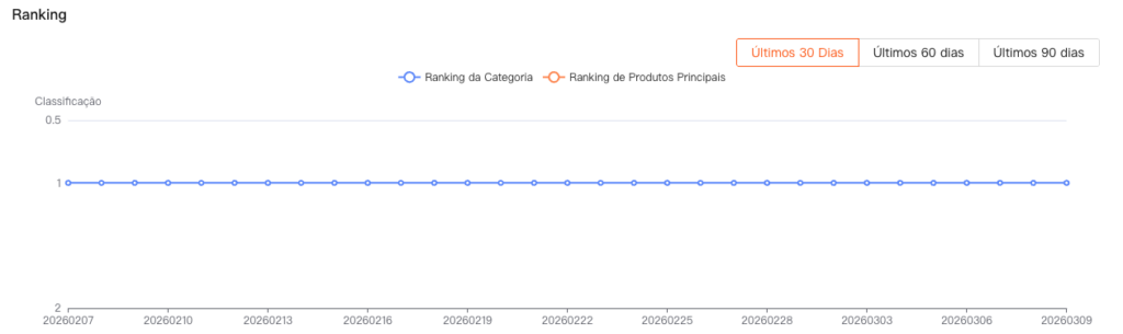 O gráfico de Ranking mostra como a posição de um produto muda ao longo do tempo, tanto em sua categoria quanto na lista de produtos mais vendidos da plataforma, ajudando os vendedores a monitorar a visibilidade e a competitividade.