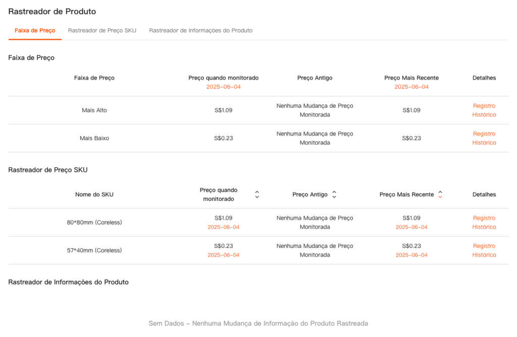 - Rastreador de Informações do Produto: Atualmente não disponível devido a atualizações nas políticas da plataforma Shopee.
